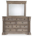 | Details | Includes dresser and mirror, Made with hardwood solids, oak and ash veneer, cast resin components and engineered wood substrates, Tops with inlaid ash veneer border, Light warm grayish brown glazed wood finish, Round metal knobs with satin nickel-tone finish, 10 drawers with fully finished interior, dovetail construction and ball-bearing side glides, Drawers with inset framed fronts, Dresser with breakfront pilasters, Mirror frame features light bridge with 2 mini LED lights, Mirror attaches to back of dresser | |