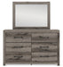 | Details | Includes dresser and mirror, Made with engineered wood (MDF/particleboard/plywood) and decorative laminate for the right balance of affordability and durability , Weathered gray finish over replicated oak grain, Decorative laminate replicates natural or man-made material surfaces with consistent color, pattern and texture, Large-scale dark colored handles, 6 smooth-gliding drawers, Drawer interiors are lined with a faux linen laminate for a clean, finished look , Safety is a top priority, clothing storage units are designed to meet the most current standard for stability, ASTM F 2057 (ASTM International), Drawers extend out to accommodate maximum access to drawer interior while maintaining safety, Mirror attaches to back of dresser; can also be mounted on wall horizontally or vertically , Minor assembly required | |