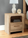 The natural wood tones and clean lines of this nightstand echo your easygoing style sensibilities. With a warm finish and replicated oak grain, its carefree character lightens up your bedroom. Curved inner corner details soften the look, while sleek bronze-tone hardware modernizes the feel. And for added convenience, USB ports keep your devices charged during pre-bedtime scrolling.
