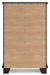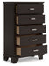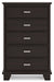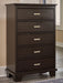 | Details | Made with hardwood solids, engineered wood veneer and MDF substrates, Dark brown finish, Metal bar pulls with bright nickel-tone finish, 5 smooth-gliding drawers with dovetail construction and metal center guides, Drawer interiors are lined with a wood grain laminate for a clean, finished look, Top moulding | |