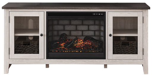 Express your farmhouse style with this TV stand with fireplace insert. Its wispy white finish over replicated oak wood grain is a delightful change...