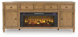 Details Made with hardwood solids, hickory wood veneer and MDF substrate, Light brown wood-tone finish, Dark bronze-tone drawer pulls, 2 cabinets, each with an adjustable shelf, 4 smooth-gliding drawers , Cutouts for wire management , Electric fireplace insert provides up to 5,386 BTU/1,500W and warms up to 1,000 square feet, 6-level temperature setting; overheating control device, 5 levels of flame brightness; LED-lit flame operates with or without infrared heat, Realistic-looking log set with dynamic glowing embers; ambient down light with on/off function, Built-in audio speakers with wireless connectivity; touch button controls and remote control; timer function with programmable ranges from 10 minutes to 9 hours, Power cord included; UL Listed, Assembly required; simply remove the center shelf and back panel to make room for the fireplace insert