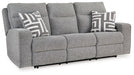 If style is the question, then this power reclining sofa is the answer. Its clean-lined profile is beautifully contemporary. High-performance fabric, machine-washable pillows and plump cushioning make it so easy to comfortably kick up your heels The adjustable Easy View™ headrest allows a primo view of the TV, and the extended ottoman provides extra room to really stretch out. Simply sit back, chill out and recline away—this sofa is designed to be your favorite seat in the house.