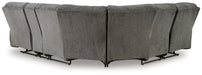 Cozy comfort is on the rise with this reclining sectional. So velvety soft, the trendy pewter-hued chenille upholstery is made for everyday indulgence. Overstuffed and stylishly wrapped, the sumptuous cushions and pillow top armrests display the comfortable side of contemporary. A padded center console with hidden storage and dual cup holders blends form and function. And with one easy pull, you're on your way to endless relaxation with plenty of room to stretch out.