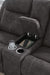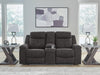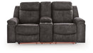 Seamlessly blend contemporary aesthetics and uncompromising comfort with this reclining loveseat. Its handsome charcoal-hued faux leather has a tailored appeal thanks to sizable stitching details. As for modern convenience? The simple one-pull reclining and ambient LED lighting encourage you to relax in style.