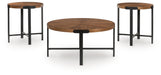 | Details | Includes coffee table and 2 end tables, Made with acacia wood veneer, MDF substrate and metal, Tops with rich brown finish, Legs with durable dark bronze-tone powder coat finish, Starburst veneer pattern, Assembly required | |