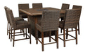 Details Accommodates up to 8; bar stools sold separately, Door conceals gas propane tank (not included), Rust-proof aluminum frame with wood-look tabletop, Side panels accented with all-weather, handwoven resin wicker, 56" square fire pit table with CSA-approved 55,000 BTU stainless steel burner, glass beads, burner cover and enclosed storage area with shelves, Battery-operated ignition system with adjustable flame control; battery included, Convertible to natural gas, Gas line or propane tank connector hose not provided, Assembly required, Comes with protective weather cover