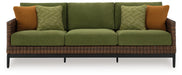 This outdoor sofa recalls the aesthetics of nature to bring an inviting, high-style feel to your patio or lanai. Its Nuvella+™ performance fabric is made with enhanced UV resistance, so the chic green hue stays brighter for longer. Worried about the weather? Don't sweat it—the durable resin wicker withstands the elements from season to season.