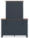 | Details | Includes dresser and mirror, Made with hardwood solids, mindi wood veneer and MDF substrates, Two-tone finish features a dark slate blue with light brown wood-tone top, Nickel-tone metal knobs, 6 drawers with fully finished interior, dovetail construction and heavy duty ball-bearing side glides, Mirror attaches to back of dresser | |