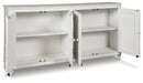 Put your love of shabby chic style on display with this wonderfully versatile cabinet. Adding to the charm of its distressed vintage paint finish: glass-inlay doors with a “free form” lattice design that’s delightfully different. Adjustable shelved storage is abundantly practical, be it in a dining room, living room or entryway.